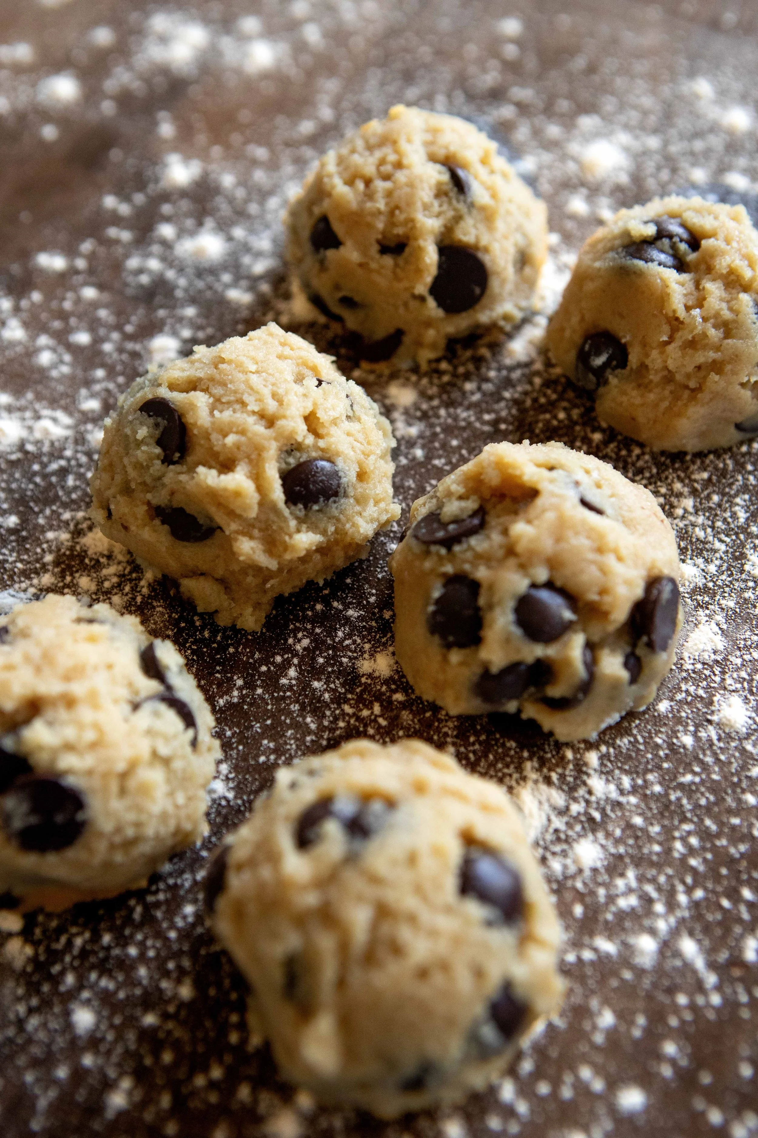• Line a baking sheet with parchment paper. Place 6 cookie dough balls evenly spaced on the tray.